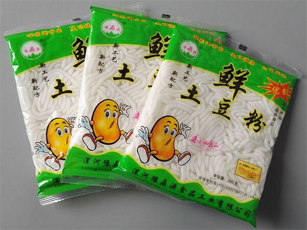 ①.半自動土豆粉包裝機:土豆粉包裝可以采用半自動定量稱重與人工包裝,需要用人工稱重后把濕粉條放入料斗內,包裝機自動包裝,設備投資較小不但可以用于濕土豆粉的包裝還可以用濕米粉、濕面條的包裝。