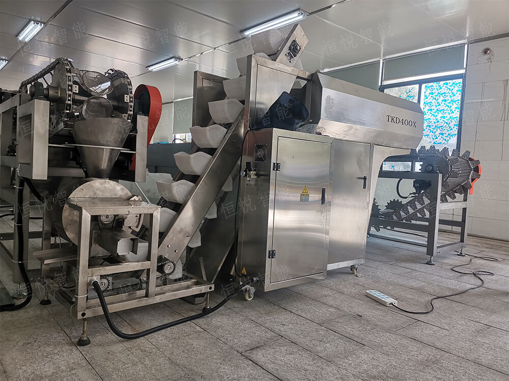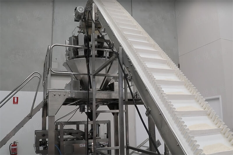 ②.全自動土豆粉包裝機:稱重裝置采用高精度多頭電子秤進行定量稱重包裝,通過用工作架臺連接與包裝機配套可實現全自動稱重包裝,整套土豆粉自動包裝生產線包含大傾角上料機、設備工作平臺、多頭電子秤、包裝主機、成品輸送機及其他附屬設施,整機具有包裝速度快效率高的特點但整體造價較高。