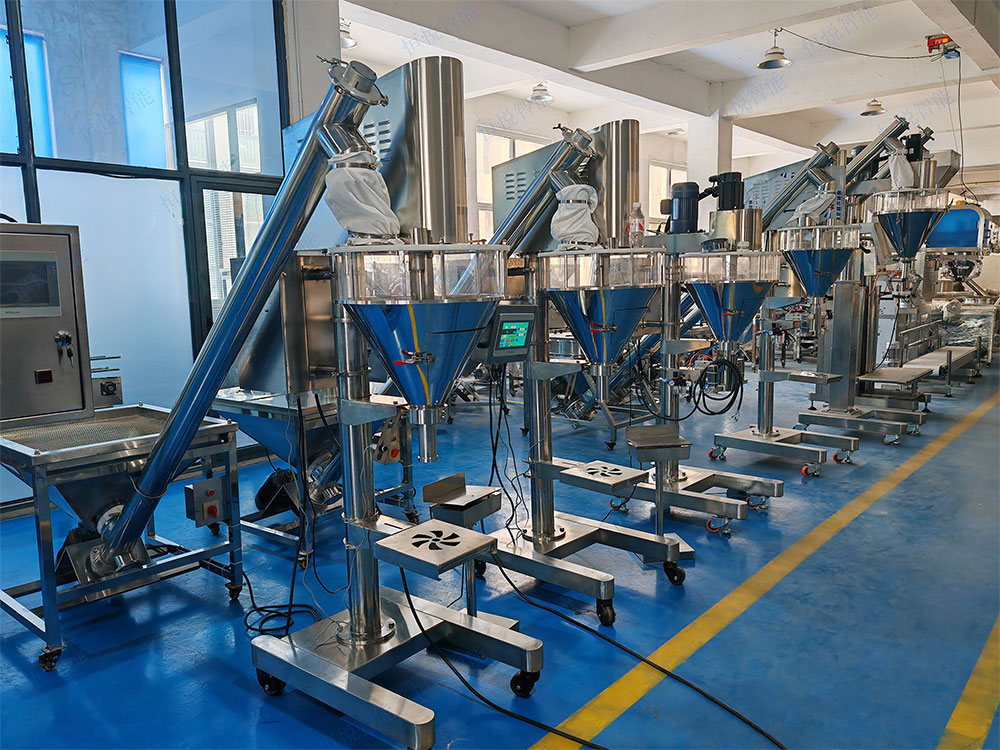⑴.粉末灌裝機核心裝置為螺桿上料機、螺桿計量充填機和帶定位裝置的鏈板輸送線,此部分為粉劑灌裝機的主要組成部分,與理瓶機、旋蓋機、封蓋機、貼標機、打碼機共同組成整套自動化粉劑灌裝機生產線,若受限于場地、資金等因素也可實現半自動粉劑灌裝線。